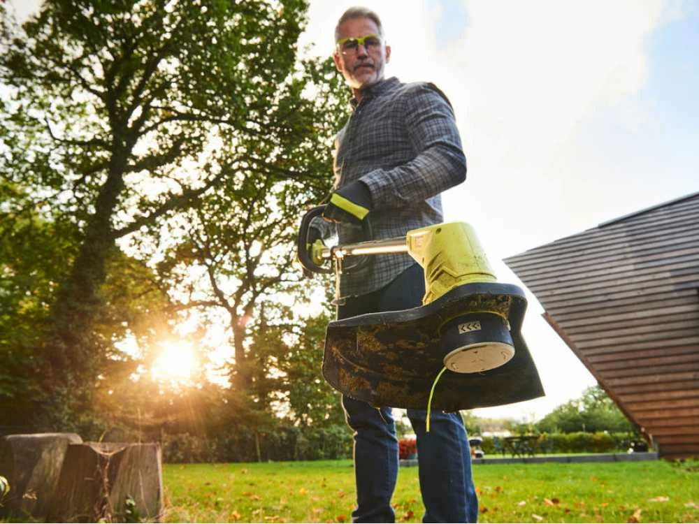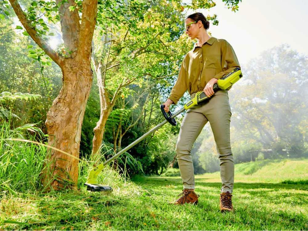 Débroussailleuse avec batterie au lithium RYOBI, un outil léger et avec diamètre de coupe de 28-33 cm.