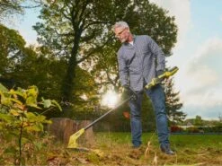 Guidon et poignée sont revêtus en caoutchouc souple, la débroussailleuse pèse uniquement 2.8 kg sans batterie et accessoires de coupe.