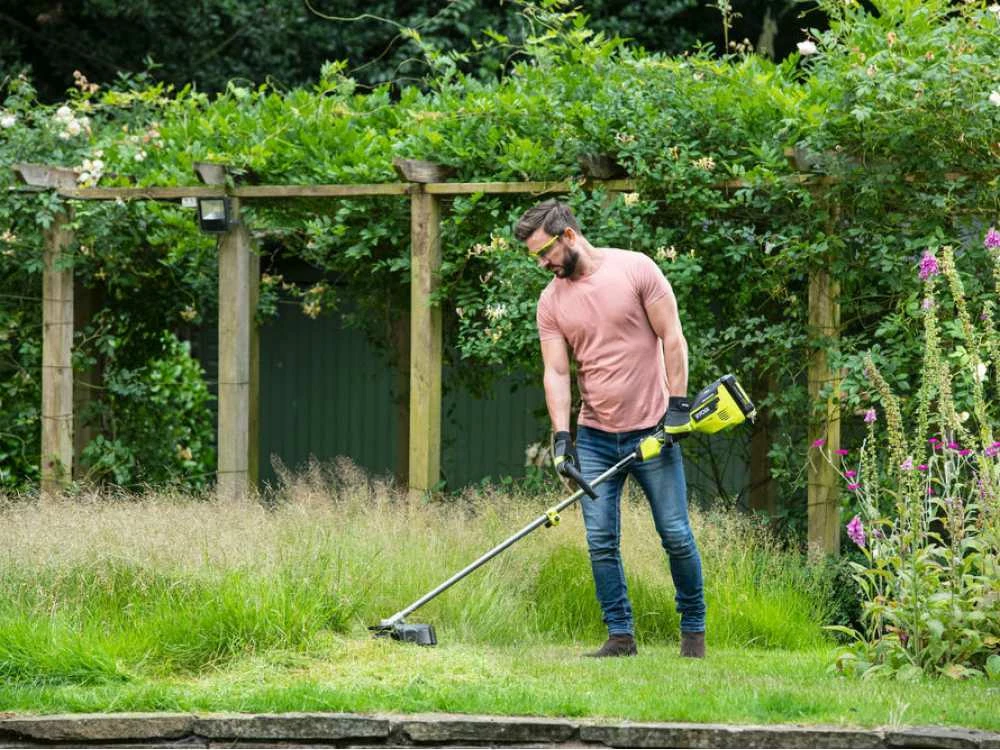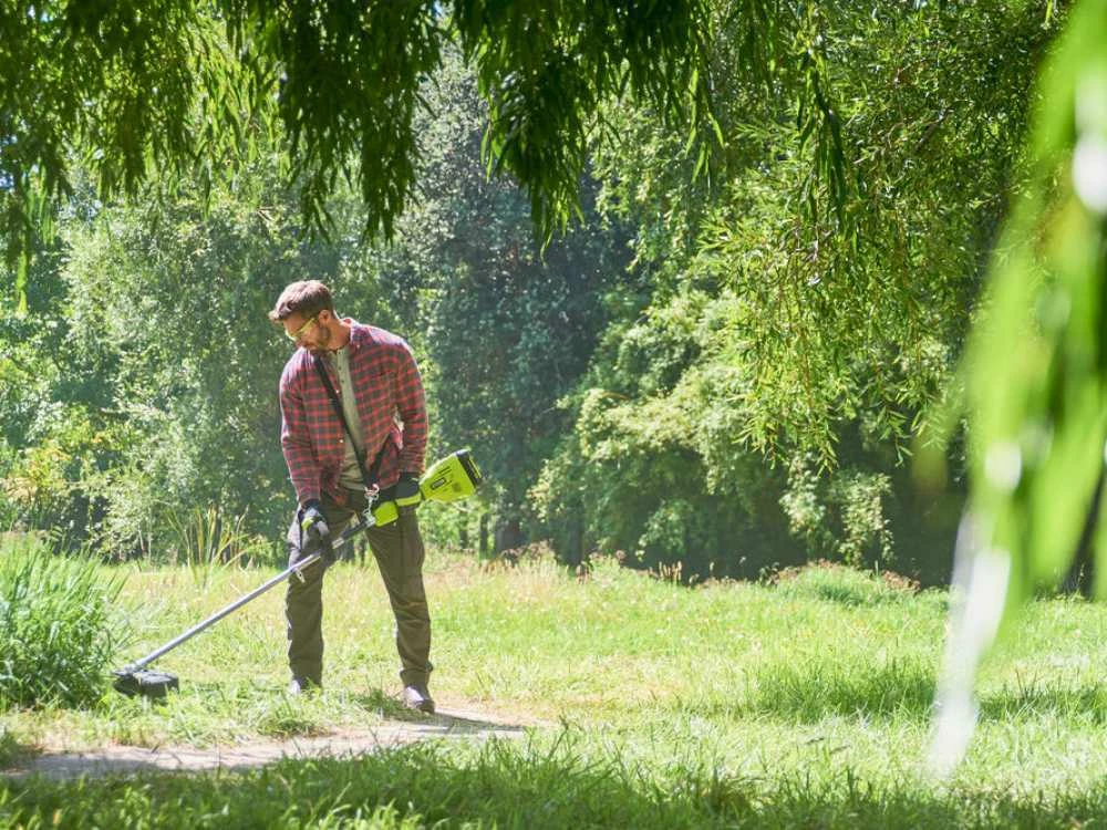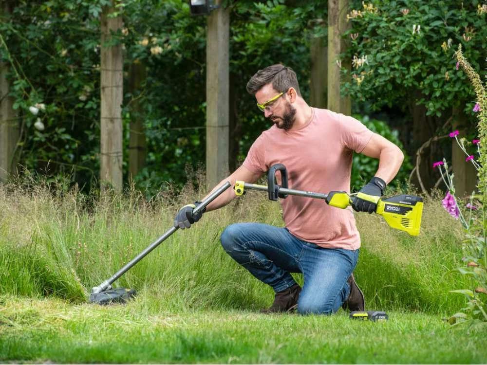 Débroussailleuse avec batterie au lithium RYOBY, un appareil léger et avec un diamètre de coupe de 28-33 cm.