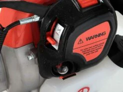 La débroussailleuse s’active très simplement grâce au système de démarrage manuel par tirage avec ressort de rembobinage, à la pompe d’amorçage d’activation à froid (starter) et au réglage de l’air.