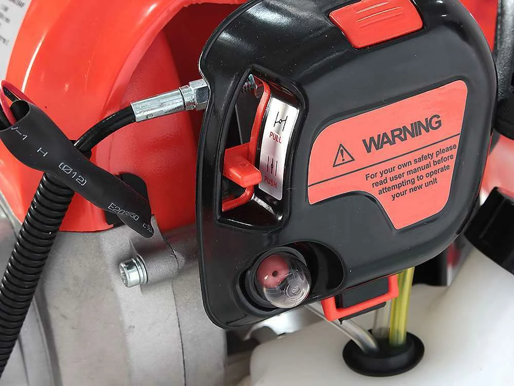 La débroussailleuse s’active très simplement grâce au système de démarrage manuel par tirage avec ressort de rembobinage, à la pompe d’amorçage d’activation à froid (starter) et au réglage de l’air.