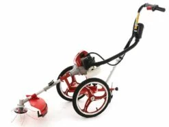 La roue arrière pivotante peut être utilisée pour paramétrer une hauteur de coupe constante et surtout pour annuler l’effort durant la phase de déplacement, car la débroussailleuse résultera bien stable sur ses trois points d’appui.