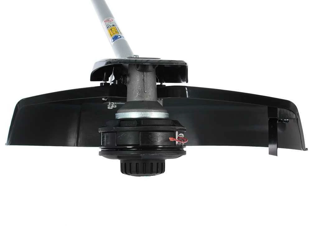 La tête de coupe de cette débroussailleuse est de type Tap n’Go et possède une bobine à déroulement automatique dotée de carter de protection avec réglage du fil.