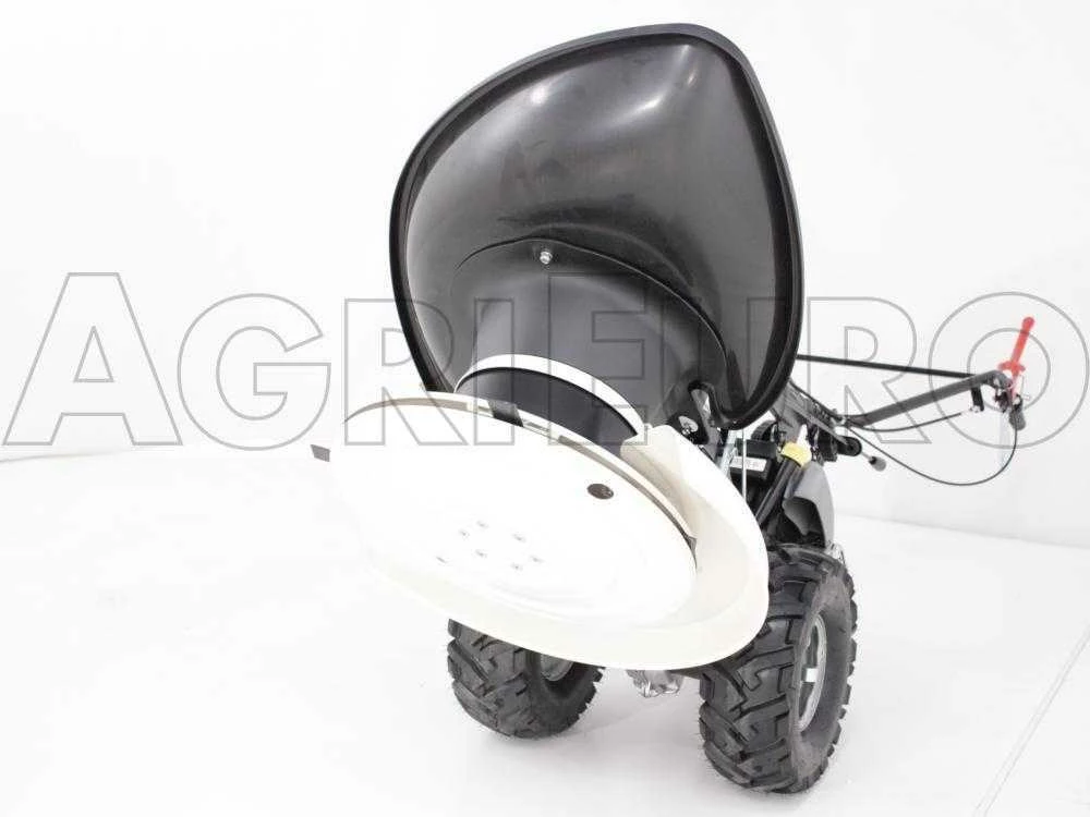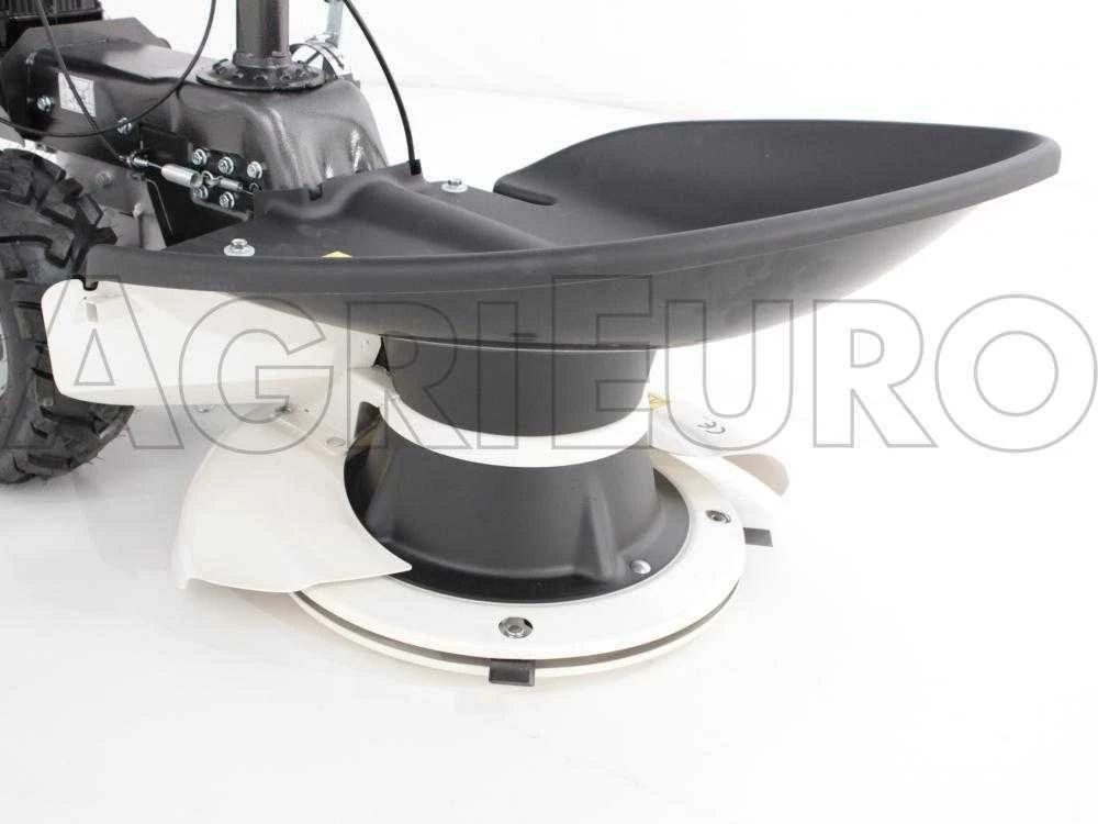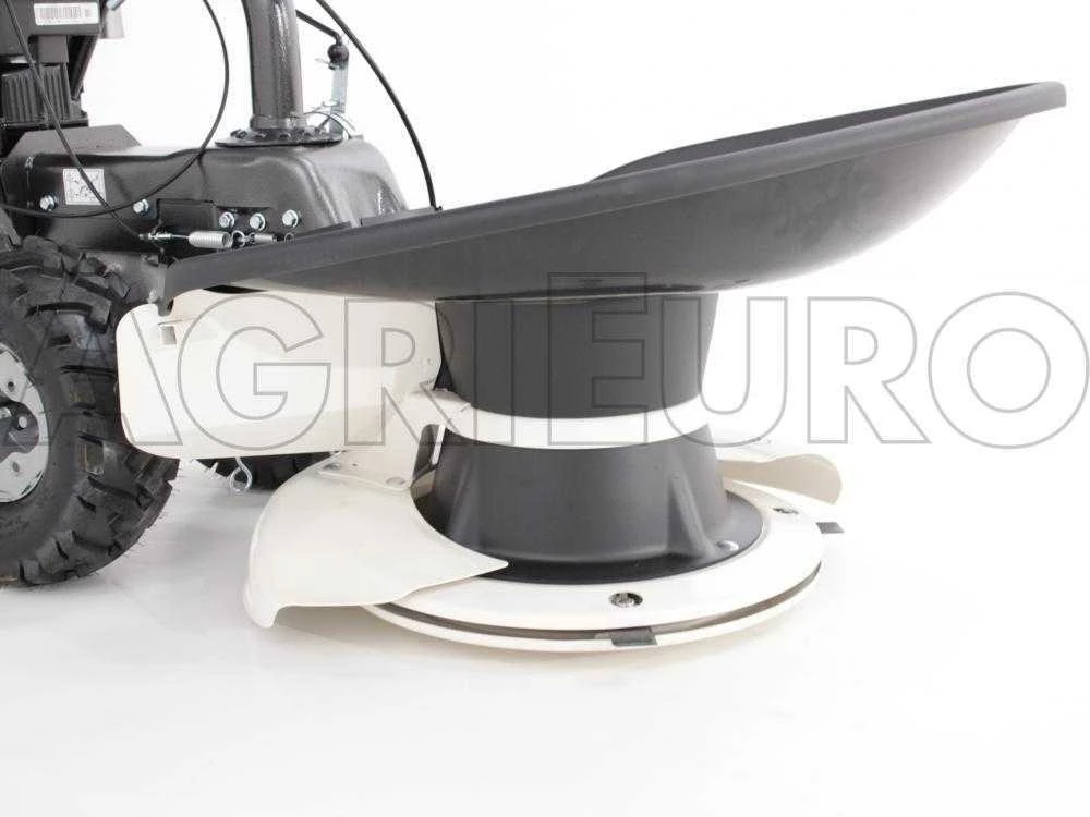Il s’agit d’une faucheuse rotative thermique autotractée avec roues pneumatiques sculptées à profil agraire dirigées par une transmission à vis sans fin à bain d’huile et dotée de 5 vitesses (3 avant + 2 arrières).