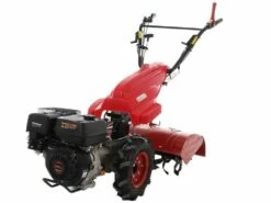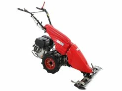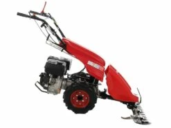 Il s’agit d’une motofaucheuse thermique autotractĂ©e Ă©quipĂ©e par des roues sculptĂ©es de grandes dimensions.