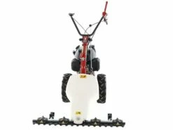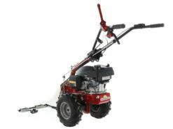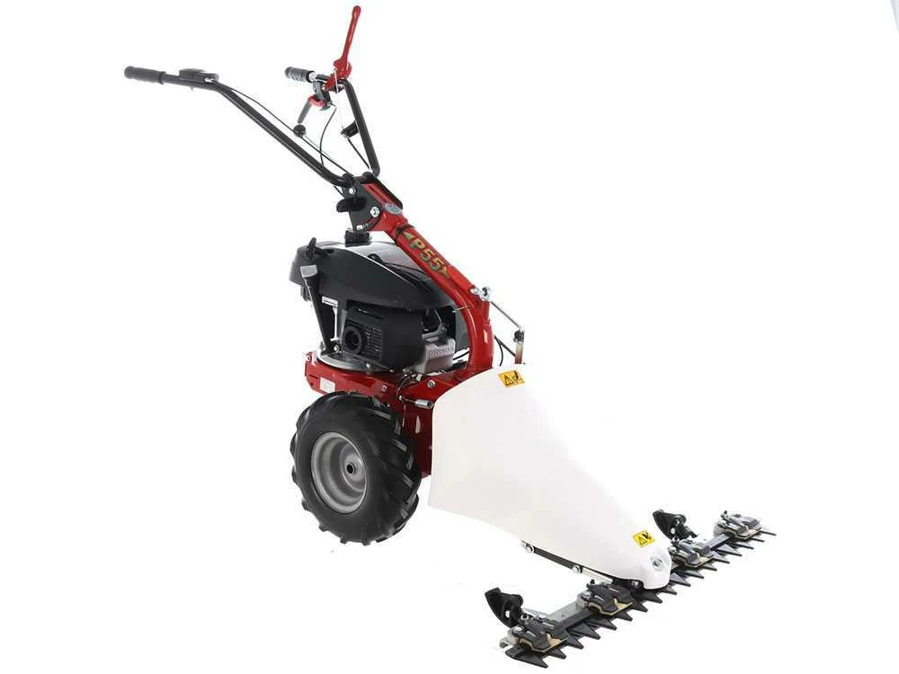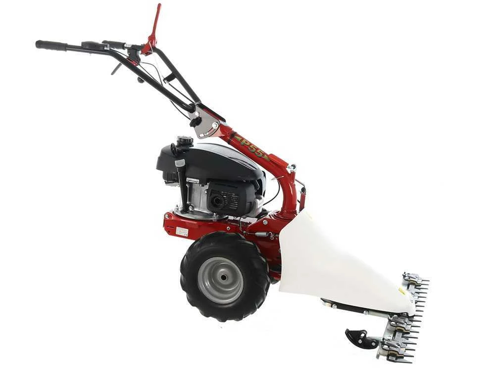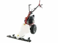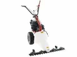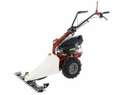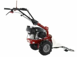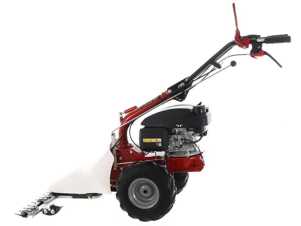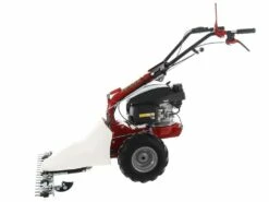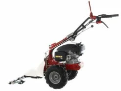 Motofaucheuse autotractĂ©e avec moteur essence Ă 4 temps, poussĂ© par de grandes roues agraires tractĂ©es reliĂ©es par une transmission Ă engrenages par bain d’huile. ce modĂšle est dotĂ© du moteur Honda GCVX 170.