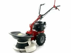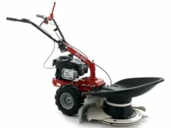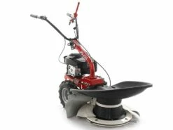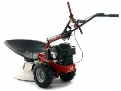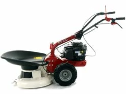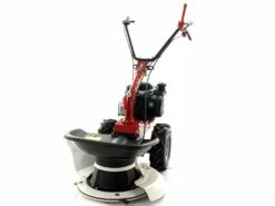 LâEurosystems RS210 est une faucheuse rotative thermique avec roues pneumatiques agricoles Ă profil tractor entraĂźnĂ©es par une transmission Ă vis sans fin par bain d’huile.