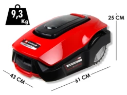 DĂšs que vous aurez montĂ© la base de recharge, terminĂ© de dĂ©limiter le pĂ©rimĂštre de travail avec le fil pĂ©rimĂ©trique et ses piquets, compris dans la confection, il suffira de programmer la taille de la surface de tonte et le robot sera prĂȘt Ă l’emploi.