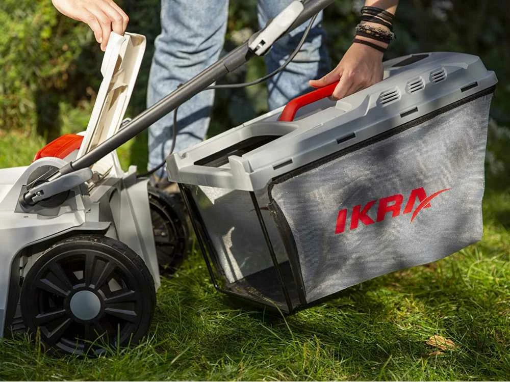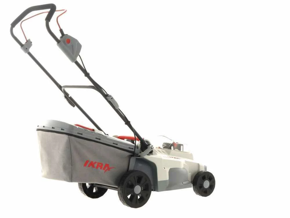 Tondeuse à gazon électrique IKRA ICM 2/2037 à batterie, avec batterie aux ions-lithium et chargeur inclus.