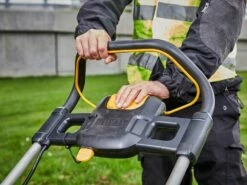 Le guidon de la tondeuse est confortable et facile à replier, grùce aux commandes prévues.