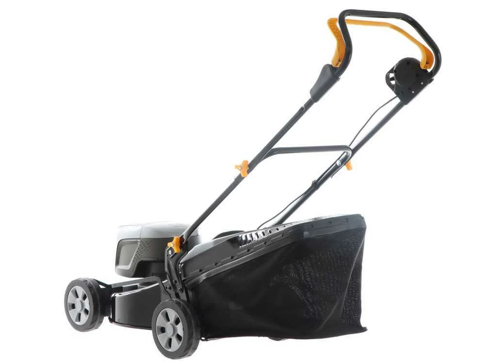 La tondeuse à gazon a une largeur de coupe de 41 centimètres et une hauteur de coupe réglable de 22 à 65 millimètres.