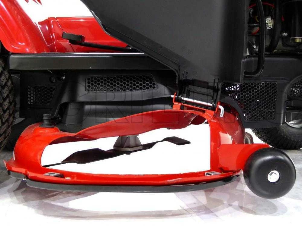 Le carter de coupe de la tondeuse autoportée est basculant : il s’adapte facilement aux ondulations du terrain (du moment qu’elles ne soient cependant pas trop rudes).