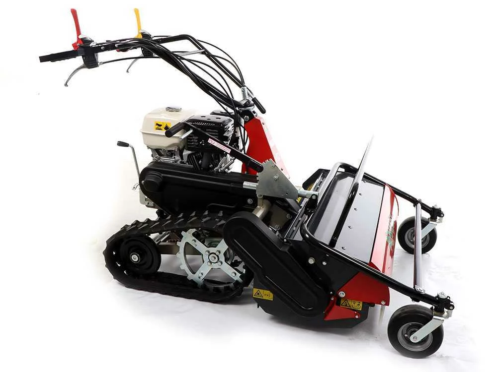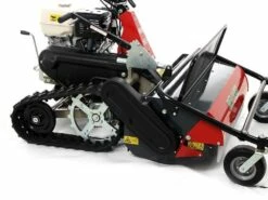 De plus les chenilles permettent à la machine de décharger à terre toute la puissance du moteur Honda de manière efficace en maintenant une stabilité sans égal durant le travail, ce qui rend le fauchage de l’herbe facile et sûr même sur des pentes qui, dans d’autres cas, seraient difficiles d’accès.