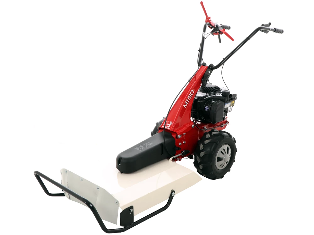 La Tondeuse débroussailleuse Minieffe Eurosystems M150 RM est une machine automotrice avec moteur thermique, équipée de roues pneumatiques à profil agraire tractées, reliés à une transmission à vis sans fin par bain d’huile.