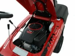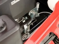 Le tracteur tondeuse est doté d’une transmission mécanique qui permet le contrôle de la vitesse de progression et des tours moteur grâce à un levier.